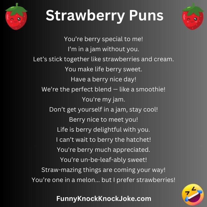 Strawberries aren’t just delicious—they’re versatile, fun, and naturally lend themselves to puns. From “You’re berry special” to “Life is berry sweet,” strawberry puns add a playful twist to everyday conversations. They’re perfect for social media captions, greeting cards, or simply spreading a little joy. Plus, who doesn’t love a pun that’s both clever and wholesome?